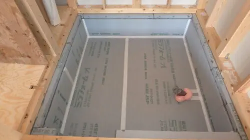基礎の立上りと外周部の床下にミラフォームλt=50を張ります。