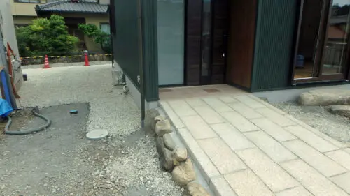玄関アプローチのサビ石敷き込み