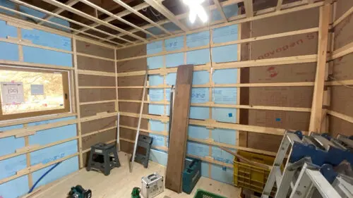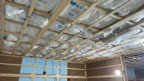 天井の下地を作成して、天井裏に袋入りグラスウール14K t=155を敷き込みます。